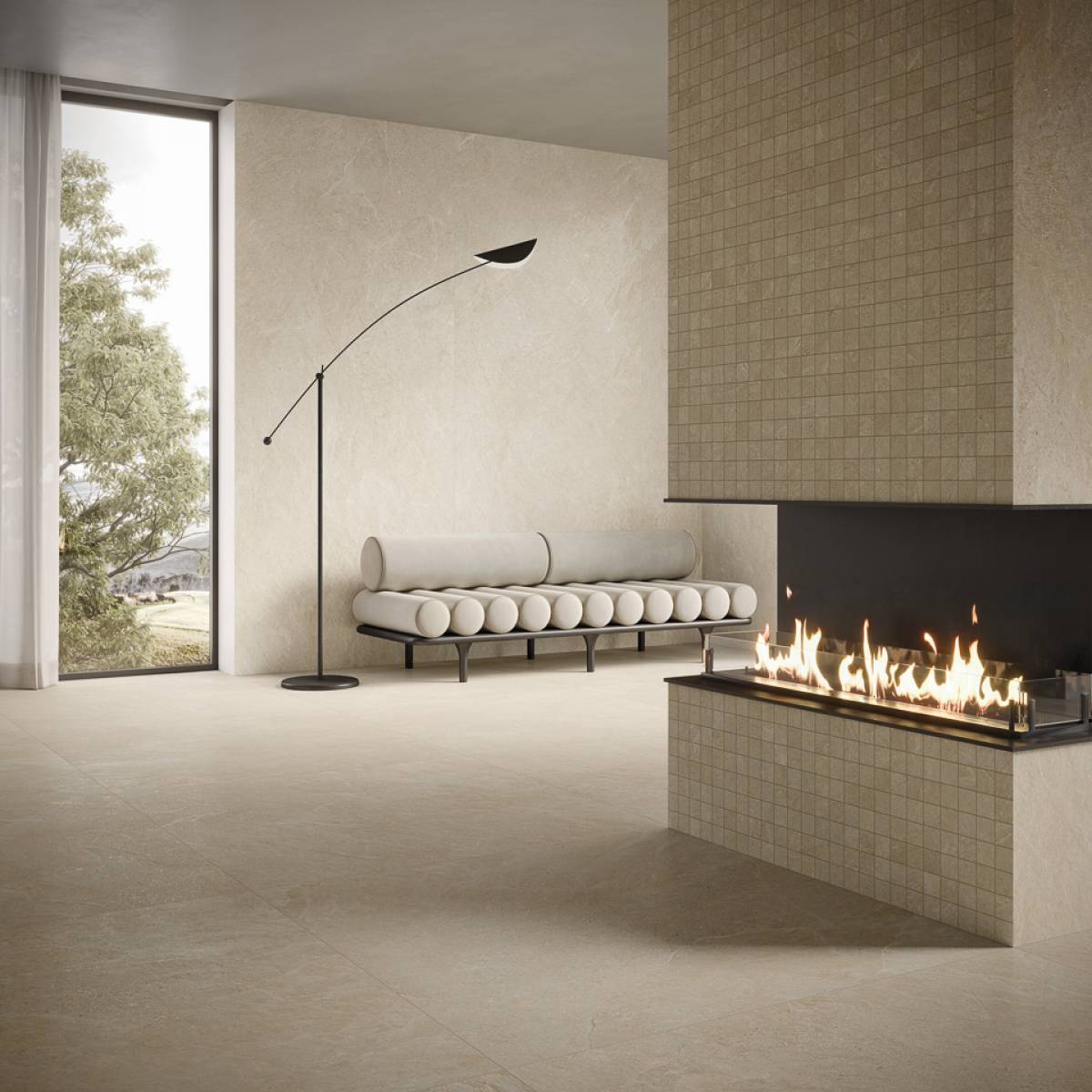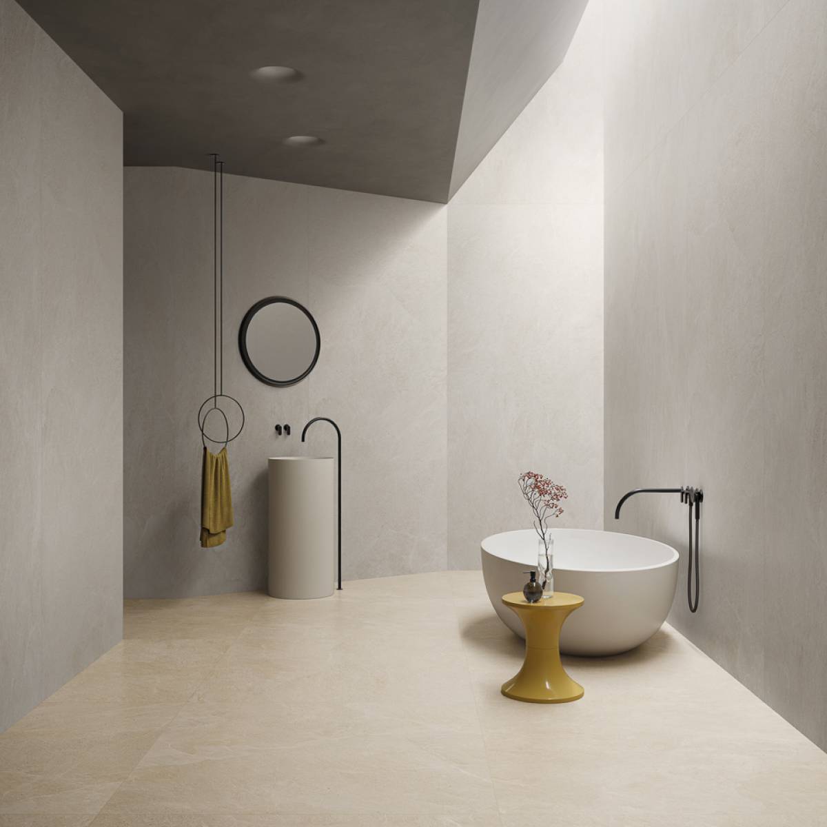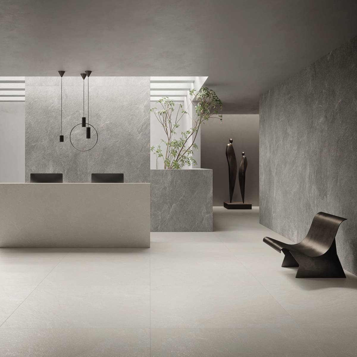 Moonstone transforme les volumes, révèle les perspectives, valorise les éclairages naturels. Son veinage irrégulier et ses nuances texturées rappellent les origines géologiques du matériau tout en offrant une esthétique moderne. Ce carrelage s'intègre avec justesse dans les environnements contemporains, industriels ou même plus traditionnels grâce à ses teintes naturelles.