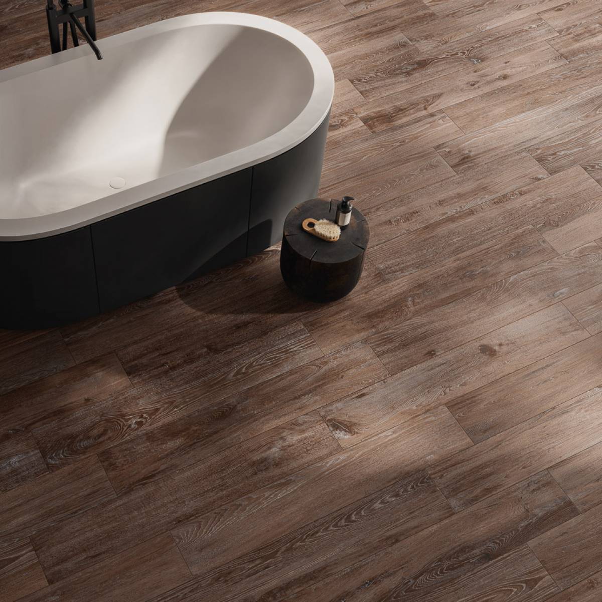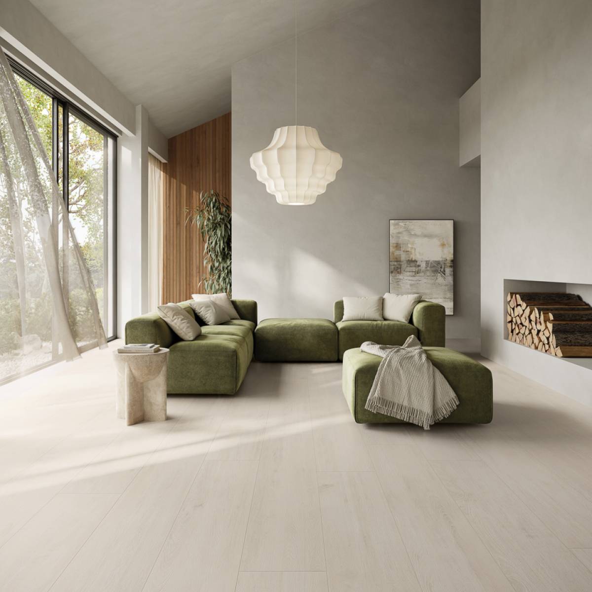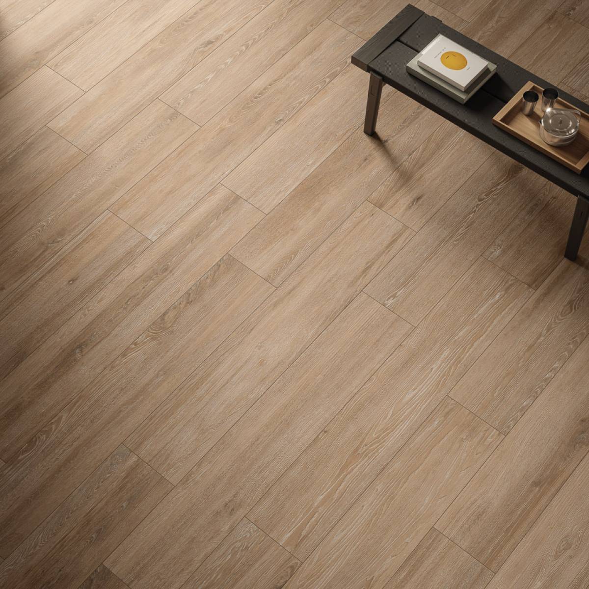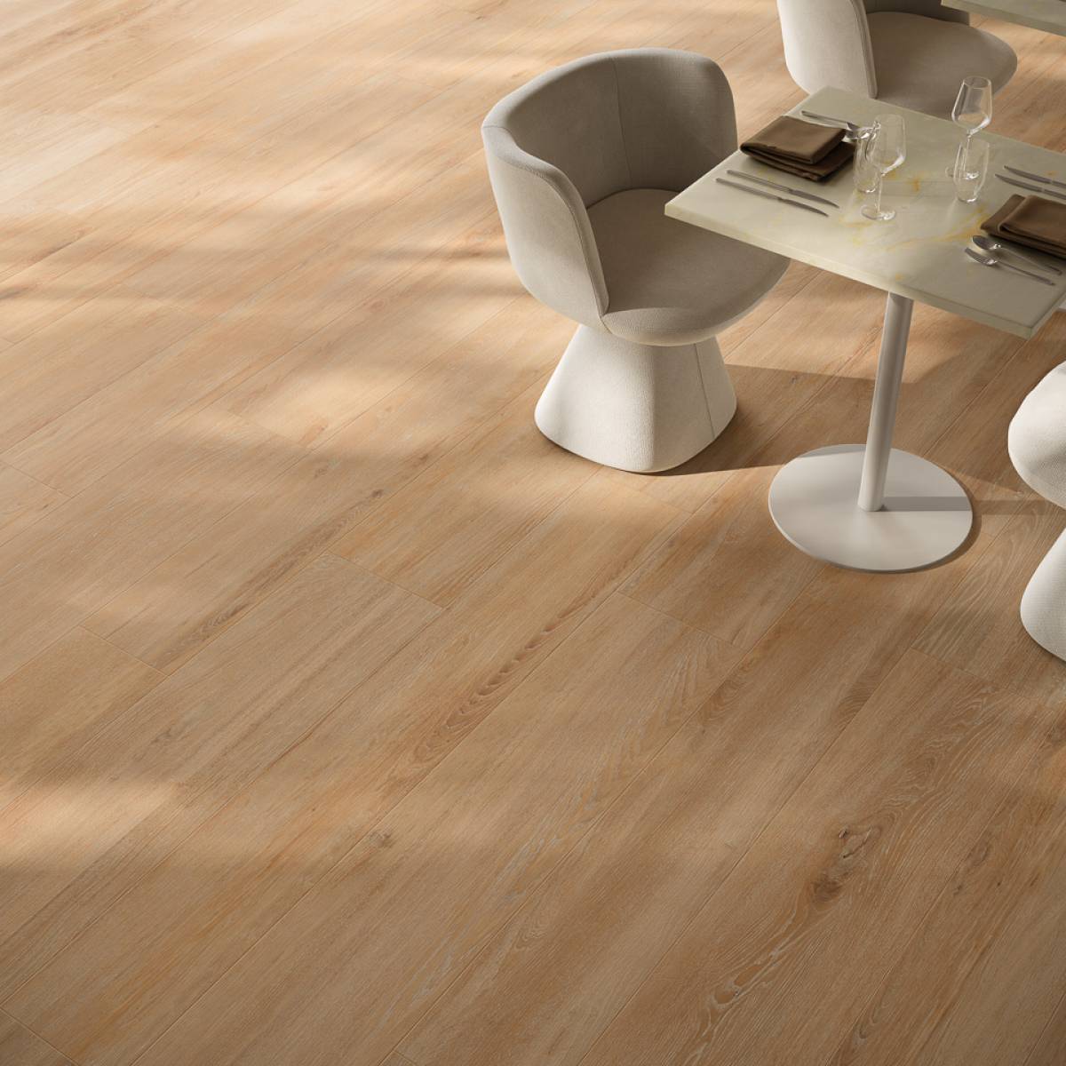Des nuances claires aux teintes plus profondes, chaque ton révèle un veinage précis, une surface mate et un léger effet brossé pour une sensation naturelle au toucher. Le grand format apporte de la continuité et agrandit les volumes, offrant une impression de parquet massif tout en garantissant la durabilité d’un revêtement céramique.