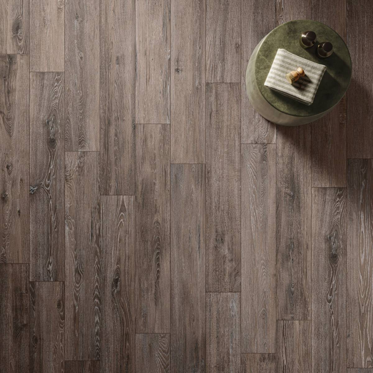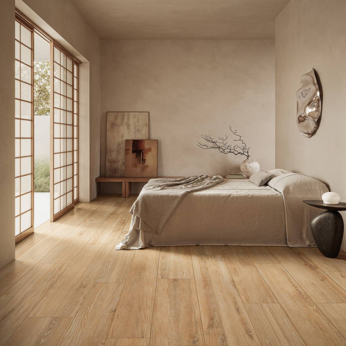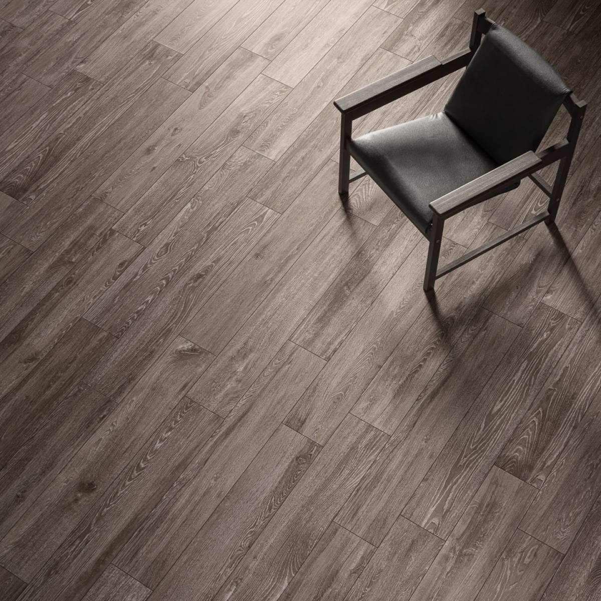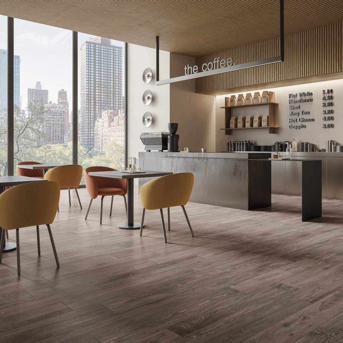 Des nuances claires aux teintes plus profondes, chaque ton révèle un veinage précis, une surface mate et un léger effet brossé pour une sensation naturelle au toucher. Le grand format apporte de la continuité et agrandit les volumes, offrant une impression de parquet massif tout en garantissant la durabilité d’un revêtement céramique.