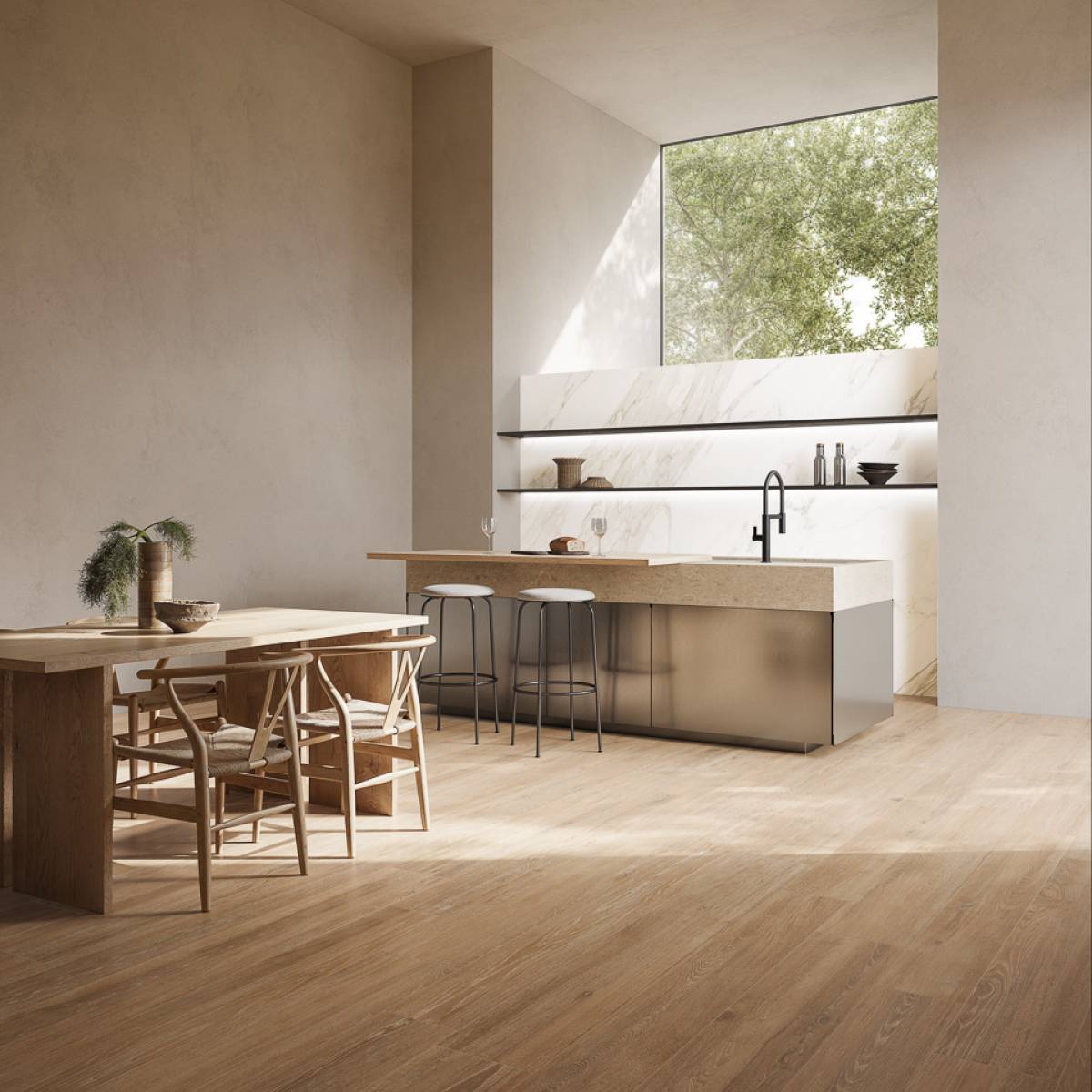 Les grandes lames – jusqu’à 165 cm – permettent des compositions raffinées, adaptées aux intérieurs modernes comme aux espaces à l’esprit plus traditionnel. La version antidérapante en 20x120 s’intègre harmonieusement sur les terrasses, les loggias et les abords de piscine pour une continuité esthétique entre intérieur et extérieur.