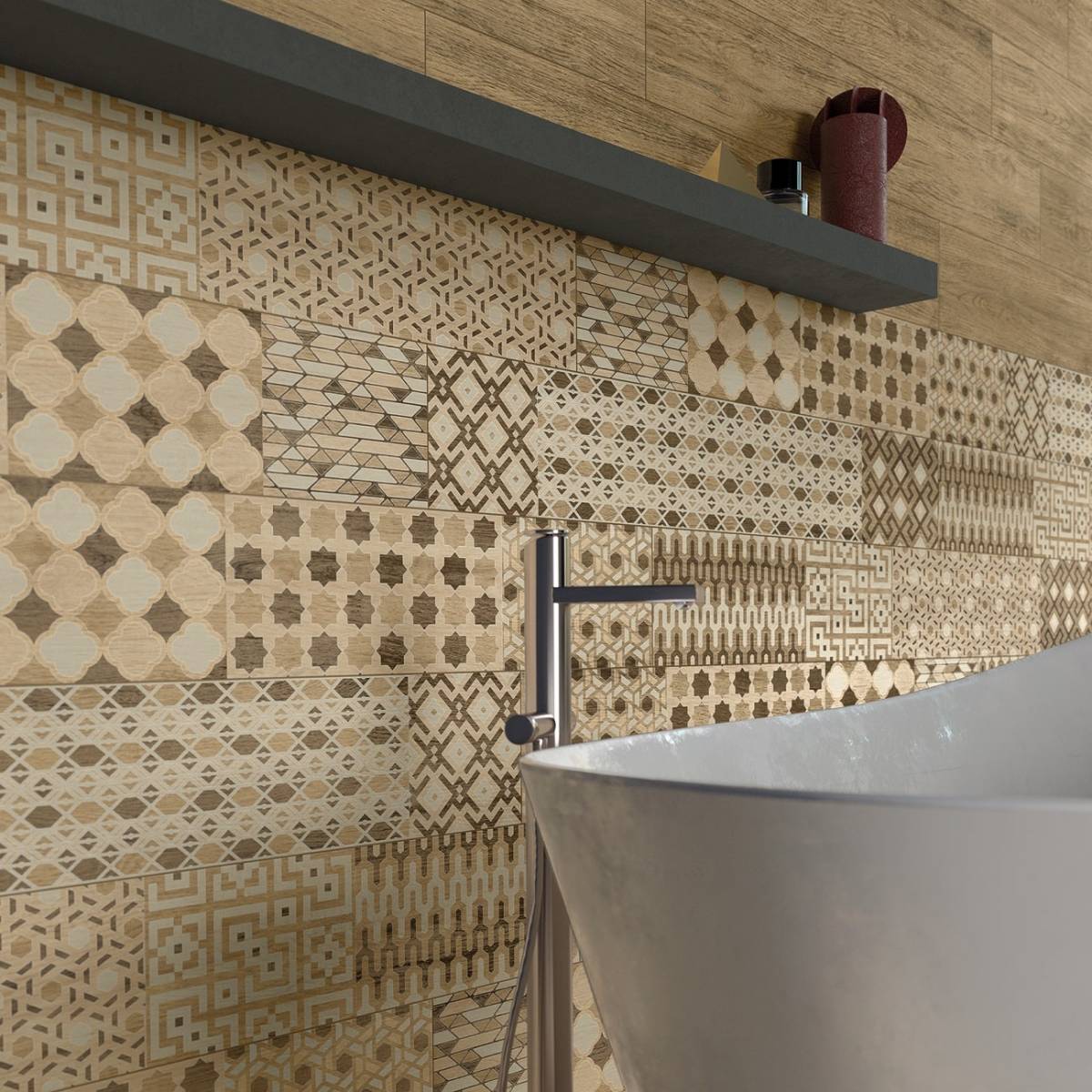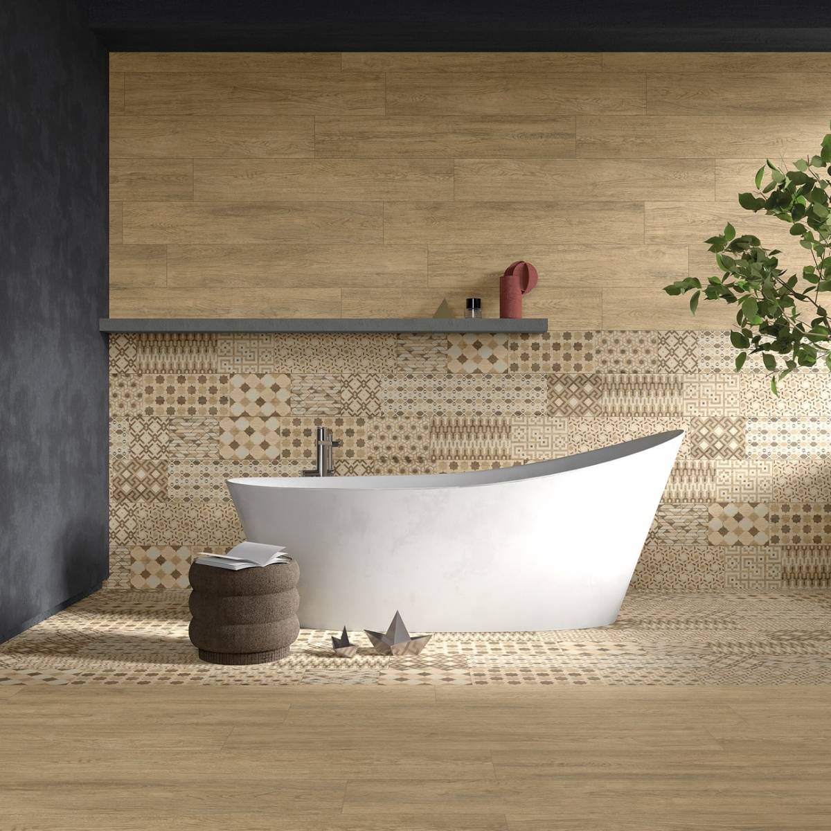 Carrelage imitation parquet bois avec décors carreaux ciment – Série utilisée sur un chantier réalisé par notre client sur Fécamp 76.