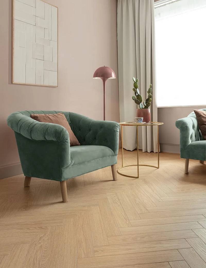 Wooden ou Native (carrelage aspect bois format 20x100) que vous pouvez poser de manière classique ou en chevron comme un vrai parquet.