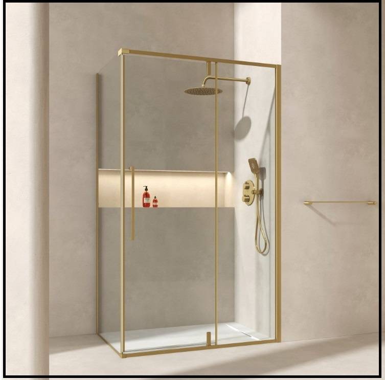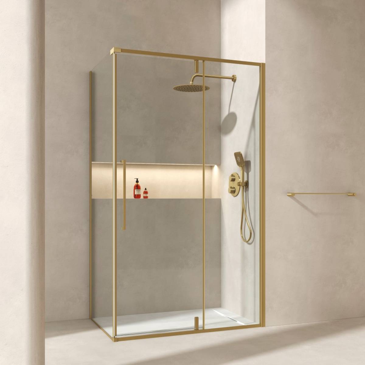La paroi de douche finition or se décline en version îlot, angle ou façade, avec ou sans porte. Elle convient aux configurations classiques ou aux douches à l’italienne plus contemporaines. Associée à un carrelage effet marbre ou terrazzo, elle crée un contraste raffiné. Combinée à des éléments noirs mats, elle s'inscrit dans une ambiance art déco ou industrielle chic.